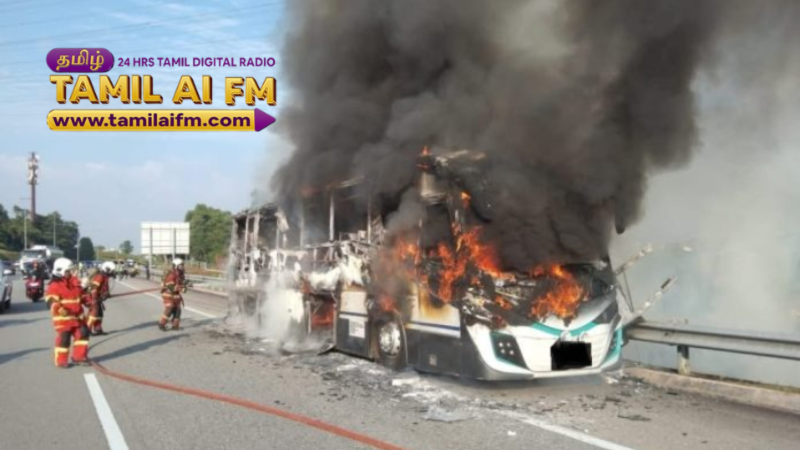வடக்கு-தெற்கு நெடுஞ்சாலையில் சுற்றுலா பேருந்து திடீரென தீப்பிடித்து பரபரப்பு.