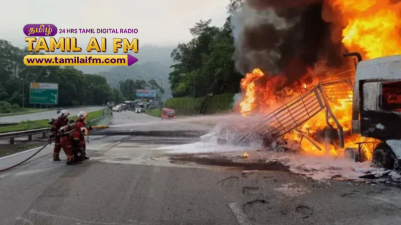 காராக் வீதியில் தீ விபத்து: 10 டன் லோரி கருகி நாசம்.