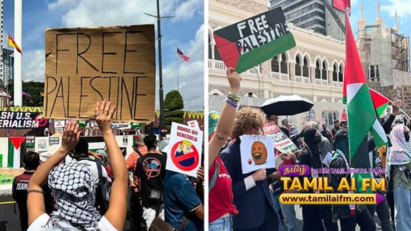 அமெரிக்க அதிபர் டொனால்ட் டிரம்பின் மலேசிய வருகையை எதிர்த்து இன்று கோலாலம்பூரில் உள்ள டத்தாரான் மெர்டேகாவில் சுமார் 100 பேர் கூடினர். பல அரசு சாரா அமைப்புகளின் உறுப்பினர்கள் அடங்கிய பங்கேற்பாளர்கள் காலை 9.30 மணியளவில் ஒன்றுகூடத் தொடங்கினர். பலர் பாலஸ்தீனக் கொடிகளை அசைத்தும், இனப்படுகொலையைக் கண்டிக்கும் பதாகைகளை ஏந்தியும், “சுதந்திர பாலஸ்தீனம்” என்று கோஷமிடுவதை காண முடிந்ததாக உத்துசான் மலேசியா தெரிவித்துள்ளது.